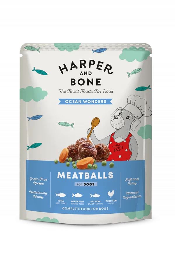 Pescado, pollo, pavo y cerdo 60% (Pescados 16%: salmón 6%, pescado blanco 5%, atún 2,5% y sardinas 2,5%. Pollo 15%. Cerdo 15%. Pavo 14%), caldo, zanahorias 3,40%, guisantes 3,25%, patata dulce 3,25%, aceite de pescado, minerales, semilla de lino (fuente natural de ácidos grasos W3) 0,01%, kelp 0,01%, rosa canina 0,01%