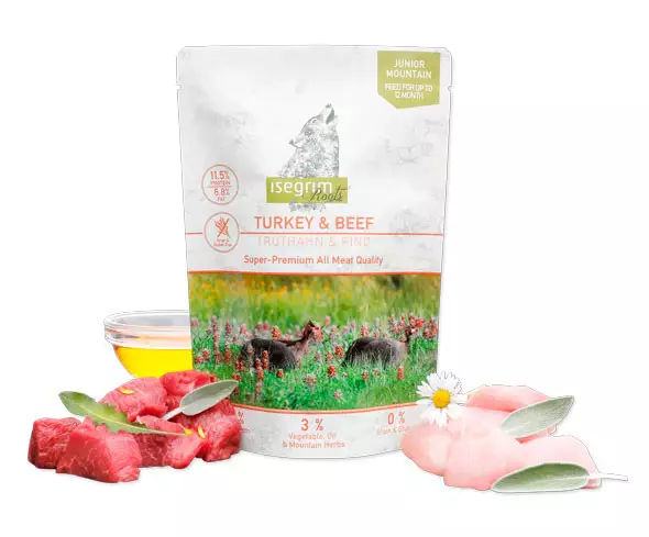 35 % Pavo, 35 % Ternera, 27 % Caldo, 1,1 % Boniato, 1 % Minerales, 0,6 % Aceite de salmón, 0,3 % Hierbas del monte