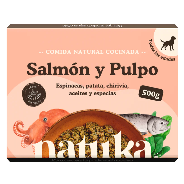 Menú cocinado de pulpo y salmón con espinacas, una receta natural y equilibrada que aporta omega 3, antioxidantes y fibra. Ideal para perros de paladar exigente, favorece la digestión, refuerza las defensas y cuida la piel y el pelaje.