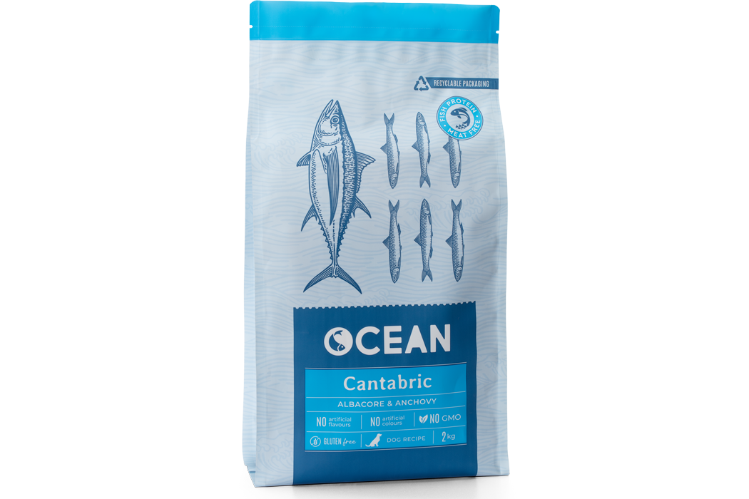 Bonito del norte (20%), anchoa cantábrica (17%), arroz (16%), guisante (15%), aceite de salmón (11%), almidón de patata (8%), fibra dietética (3%), pulpa de remolacha (3%), proteína hidrolizada de salmón (2%), algas ricas en DHA (1%), lecitina (1%), FOS, MOS, L-carnitina, glucosamina y sulfato de condroitina.