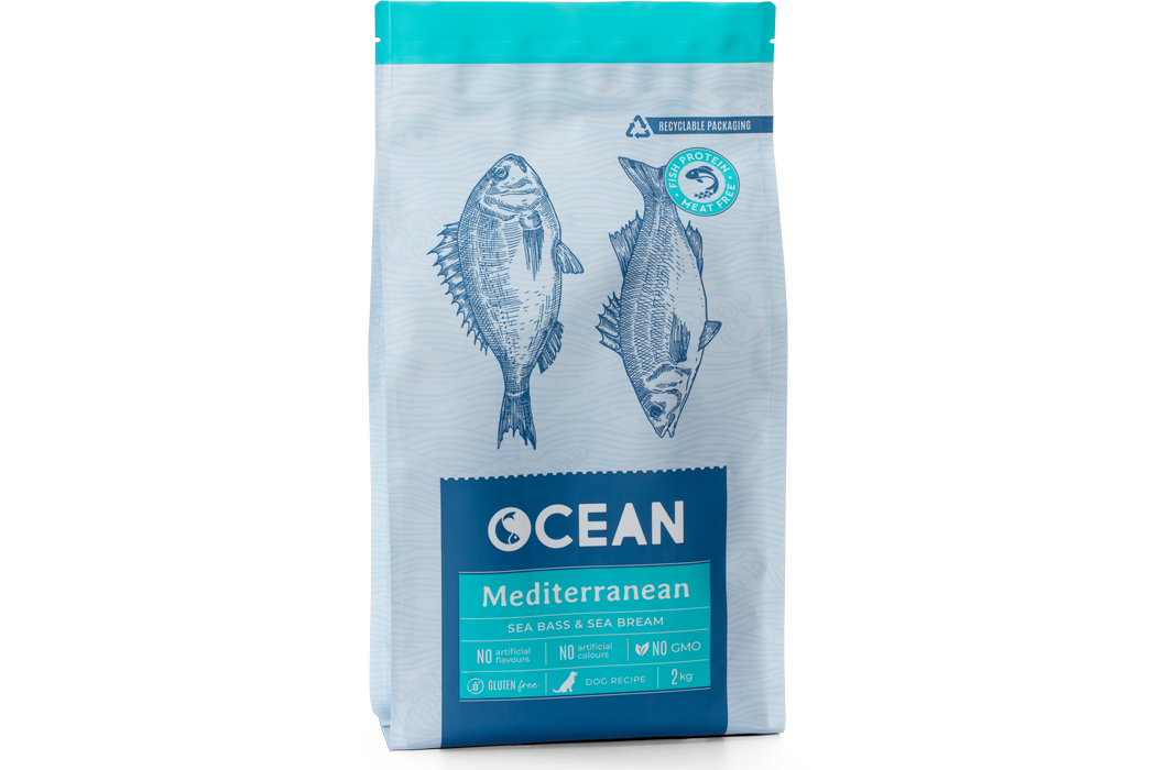 Lubina (22%), arroz (21%), dorada (16%), guisante (15%), aceite de salmón (8%), almidón de patata (5%), fibra dietética (3%), pulpa de remolacha (3%), proteína hidrolizada de salmón (2%), algas ricas en DHA (1%), lecitina (1%), FOS, MOS, L-carnitina, glucosamina y sulfato de condroitina.