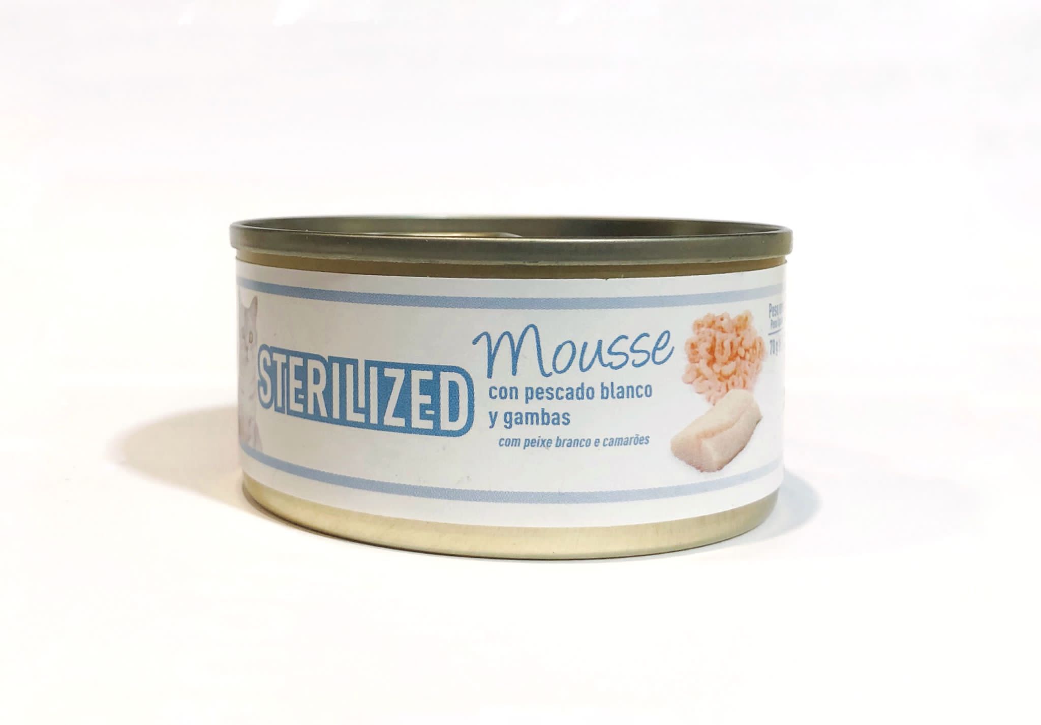 Alimento húmedo para gatos esterilizados que se presenta en un innovador formato de tarrina monodosis de 70 g de mousse con pescado blanco y gambas.